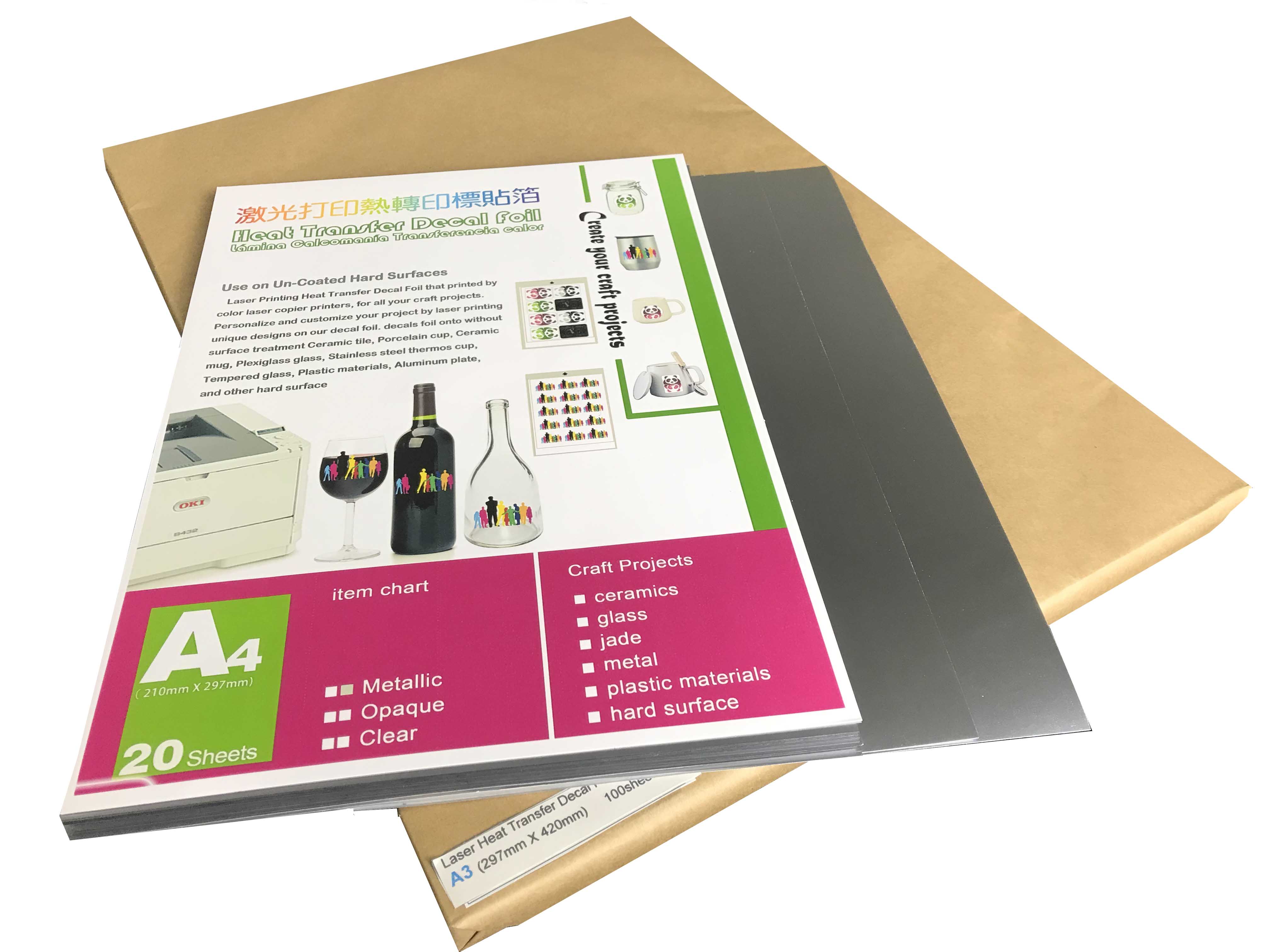 Laser Transfer Decal Foil (HSF-L-S-300) can be painted by Universal color laser printer, such as OKI C5600O, C941dn, Xerox AltaLink C8100,Ricoh IM C6010, etc. and Fine-Cut by desk cutting plotter such as Silhouette CAMEO, Circut etc. for all your craft projects. Personalize and customize your project by printing unique designs on our decal foil. Transfer decals foil onto No surface treatment (un-coated) ceramic tile, marble, porcelain cup, ceramic mug, Plexiglass glass, stainless steel thermos cup, tempered glass, crystal stone, Aluminum plate, metal, plastic materials and other hard surface.
