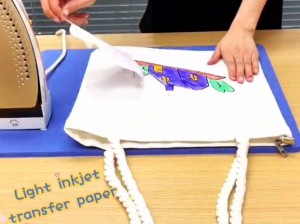 Light inkjet transfer paper (HT-150EP) is developed and produced by us based on the needs of the North American market with popular affordable, easy-to-use, it is recommended with wax crayons, Oil pastels, fluorescent markers, color pencil and all inkjet printers for white or light colored cotton fabric, cotton/polyester blend, 100%polyester, cotton/spandex blend, cotton/nylon etc. The back paper can be peel off easily with hot and can be applied with a regular household iron, Mini heat press, or heat press machine.