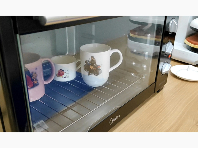Put the ceramic cup in the electric oven, close the door, and adjust the time knob to 5~10 minutes. When the baking time is reached, open the oven door, put on high-temperature resistant gloves, take out the ceramic cup, and place the cup on a heat-resistant table.